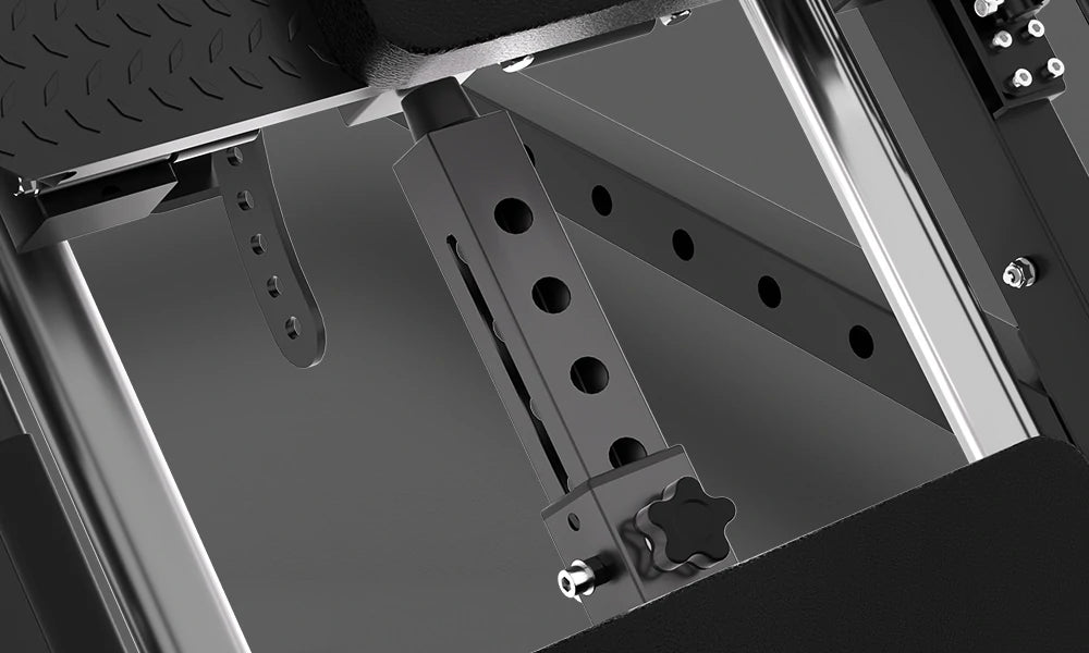 Built to withstand intense sessions, the plate-loaded carriage system is housed securely beneath the machine. 5 lockout positions on each side facilitated by a spring recoil mechanism simplify racking and unracking. An added 5 safety stoppers at the base ensure users are protected, preventing the machine from descending too low.